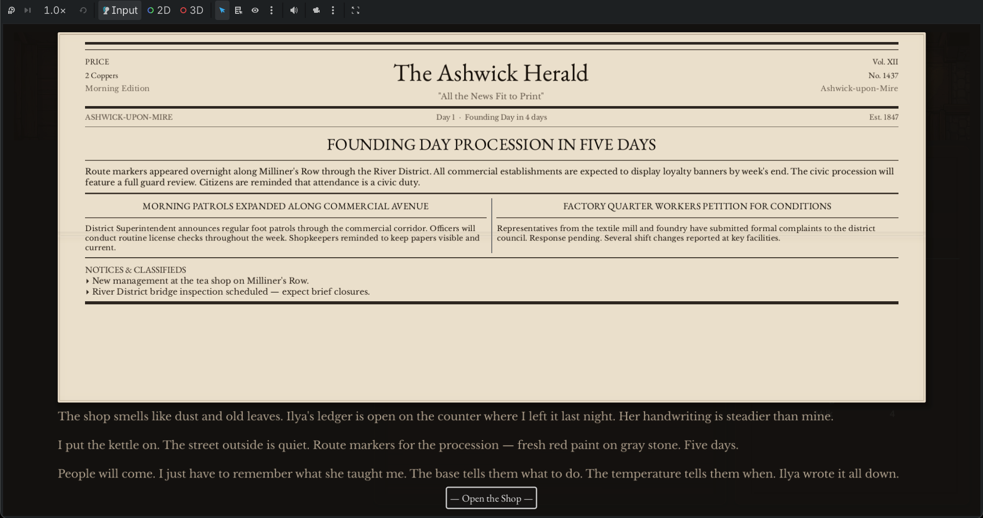 Daily newspaper — *The Ashwick Herald* delivers escalating headlines, propaganda, and player-reactive narration