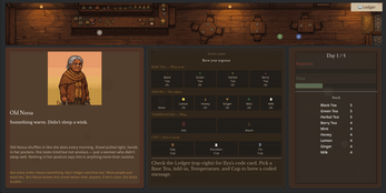 Characters remember what you've done. The courier who trusted you early speaks differently on Day 4. The inspector's opening line shifts if suspicion is high. Some high-stakes brews are only available if you've built the right relationships, try to send an emergency message through someone who doesn't trust you, and you'll find out why.
