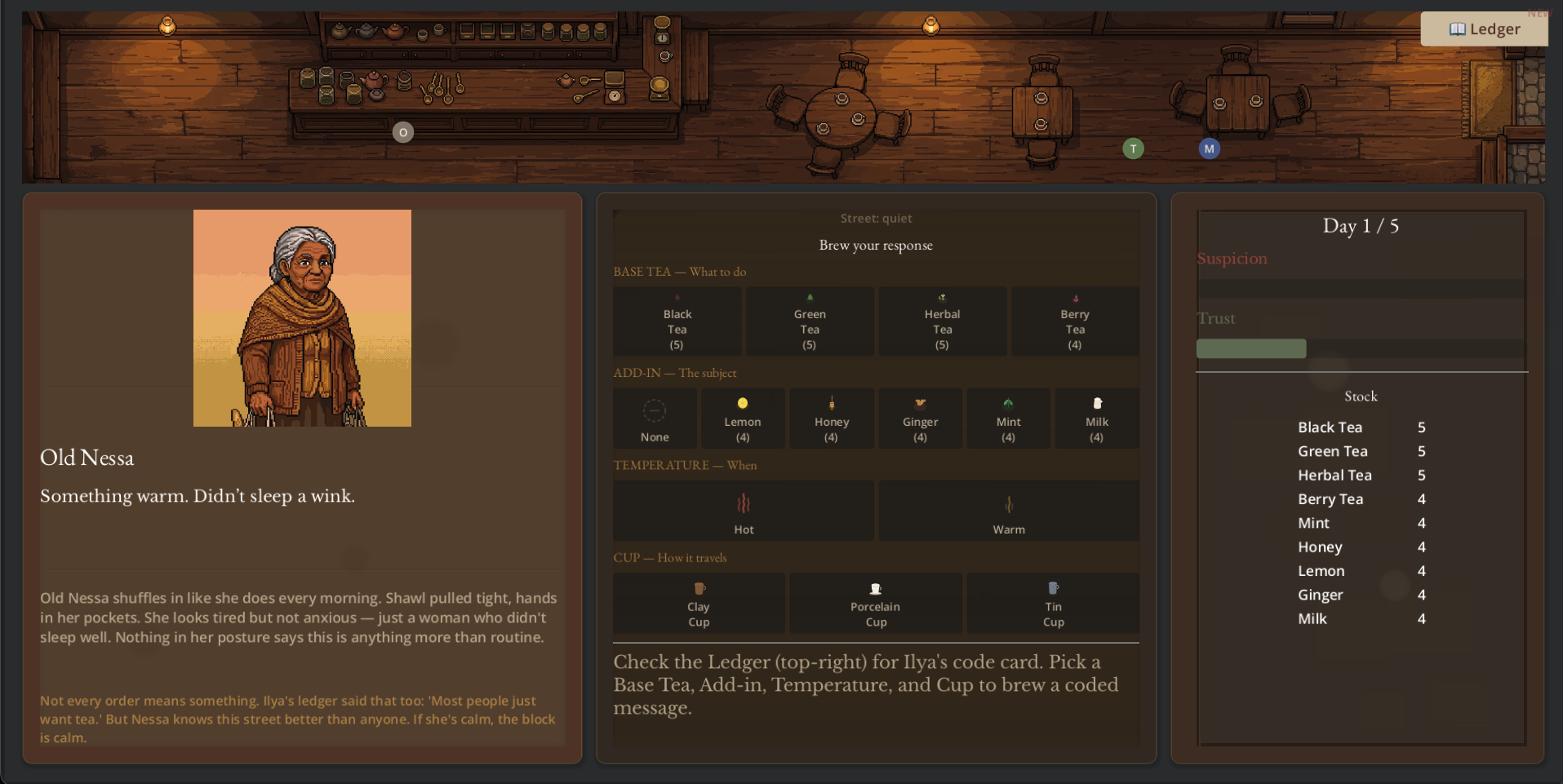 You've inherited a tea shop on Milliner's Row from a woman named Ilya. Hidden in the margins of her ledger is something more than recipes — a coded language built into the tea itself. Every drink you serve is a sentence: the base encodes a stance, the add-in encodes a subject, the temperature encodes timing, and the cup encodes a channel.
